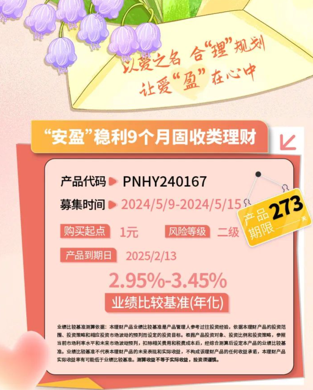 徽银理财、北银理财等机构发布节日专属理财产品,基本为固收类理财产品。如徽银理财发布的“安盈”稳利9个月固收类理财,募集期为5月9日至5月15日,产品风险评级为PR2,业绩比较基准为2.95%至3.45%,产品期限273天,2025年2月13日到期。