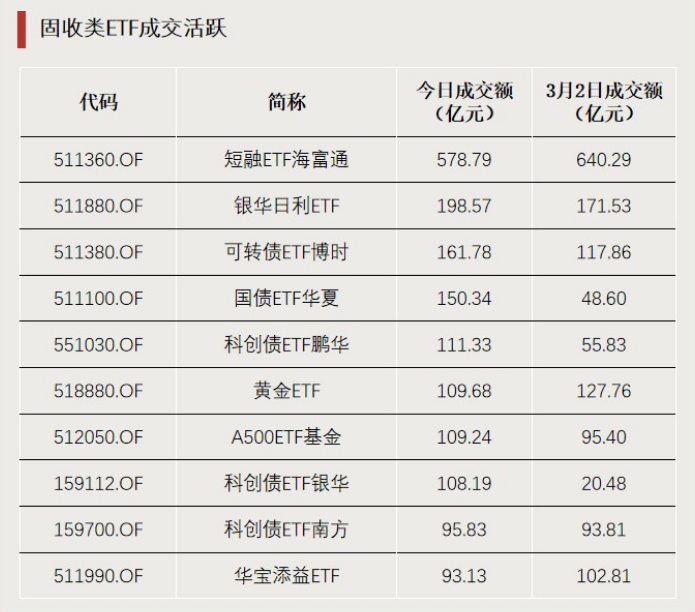今日,固收类ETF成交活跃,短融ETF海富通成交额近580亿元,可转债ETF博时、国债ETF华夏、科创债ETF鹏华、科创债ETF银华等债券ETF成交额均超过100亿元。