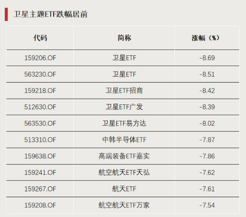 今日,卫星主题ETF跌幅居前。多只卫星、航空航天相关ETF跌超7%。