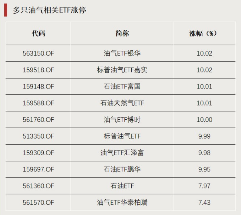 3月3日,油气股再度走强,相关ETF集体大涨。油气ETF银华、标普油气ETF嘉实、石油ETF富国、石油天然气ETF等相关ETF涨停,涨幅前十的ETF再度被油气相关ETF“霸榜”。