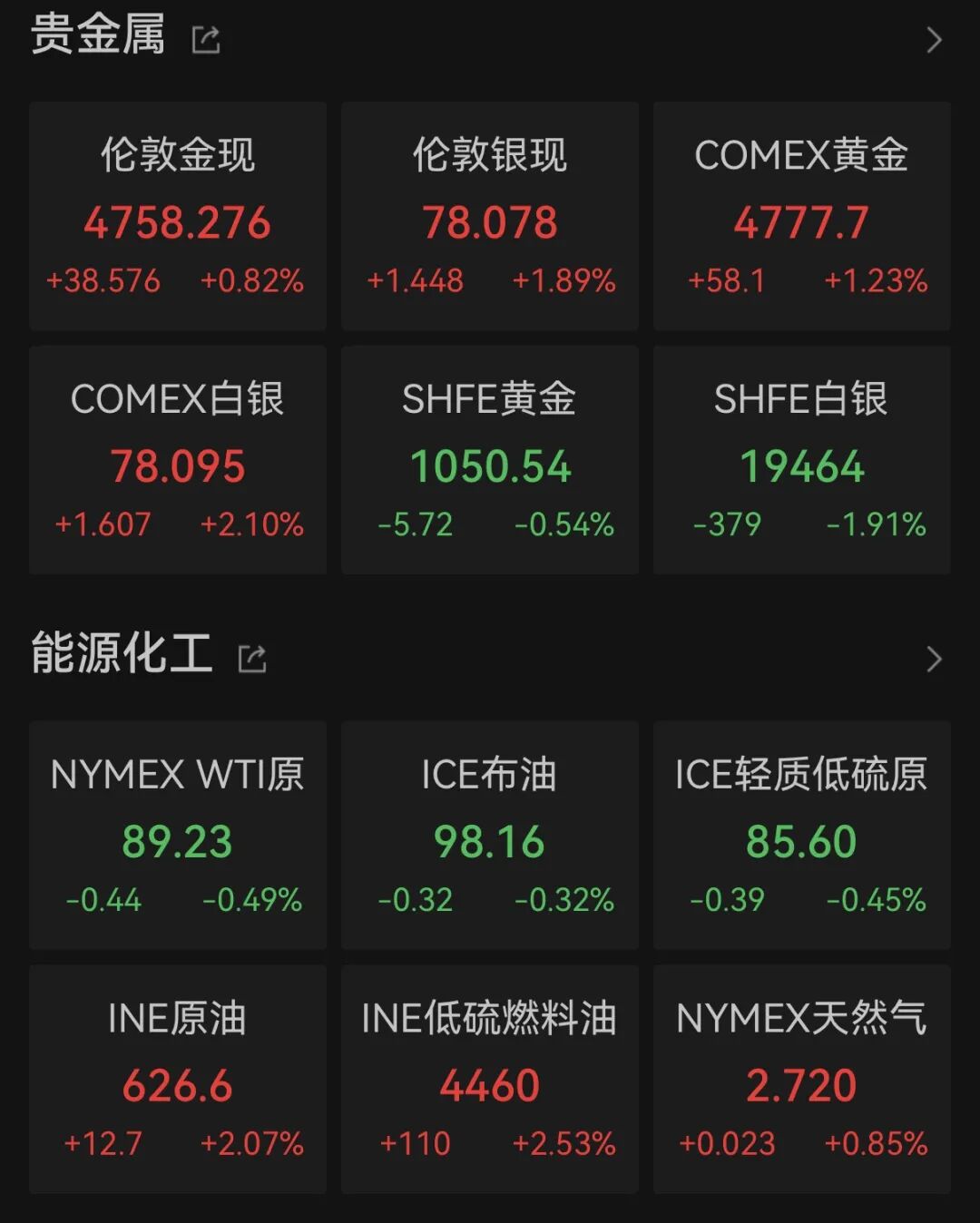 受中东局势尚不明朗消息影响,北京时间4月22日,国际金、银价格上行,国际油价小幅下跌。Wind数据显示,截至北京时间12:00,COMEX黄金期货价格上涨1.23%,COMEX白银期货价格上涨2.1%,伦敦金现价格上涨0.82%,伦敦银现价格上涨1.89%。NYMEX WTI原油下跌0.49%,ICE布油下跌0.32%。