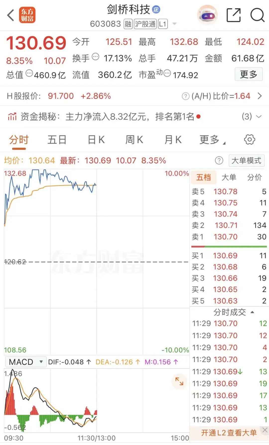 昨天下午15:11,剑桥科技H股突然爆发,股价持续拉升,收盘涨超10%。今天上午,剑桥科技A股高开高走,股价一度涨停,上午收盘,剑桥科技涨超8%。