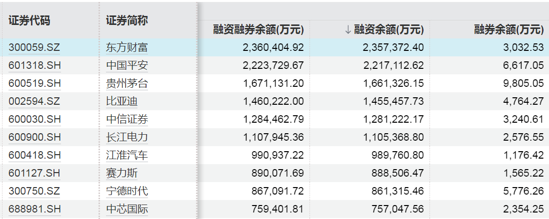 个股方面,东方财富、中国平安、贵州茅台融资余额居前,分别为235.74亿元、221.71亿元、166.13亿元,比亚迪、中信证券、长江电力融资余额均超100亿元。