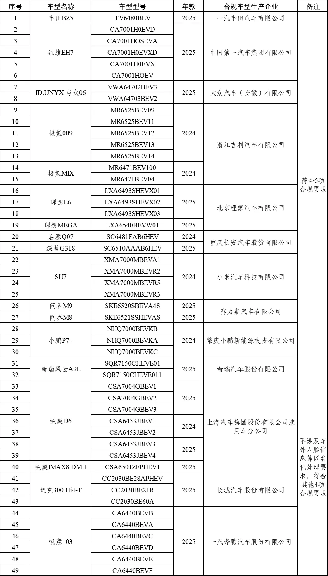 8月18日,据“中国汽车工业协会”微信公众号消息,自2025年4月起,中国汽车工业协会、国家计算机网络应急技术处理协调中心、中国信息通信研究院、国家工业信息安全发展研究中心组织对汽车制造商汽车产品数据安全合规情况进行检测,涵盖车外人脸信息等匿名化处理、座舱数据车内处理、默认不收集座舱数据、处理个人信息显著告知、精度范围适用等5项合规要求。一汽丰田、一汽集团、大众汽车、浙江吉利、北京理想、重庆长安、小米汽车、赛力斯、肇庆小鹏、奇瑞汽车、上汽集团、长城汽车、一汽奔腾等13家企业的49款车型符合汽车数据安全5项合规要求(部分车型不涉及车外人脸信息等匿名化处理要求)。具体汽车车型名单如下: