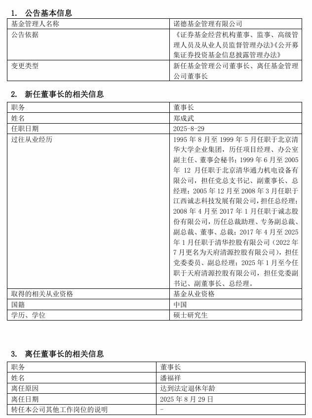 8月29日晚间,诺德基金发布公告称,原公司董事长潘福祥达到法定退休年龄,自即日起卸任公司董事长职务,郑成武接任公司董事长职务。
