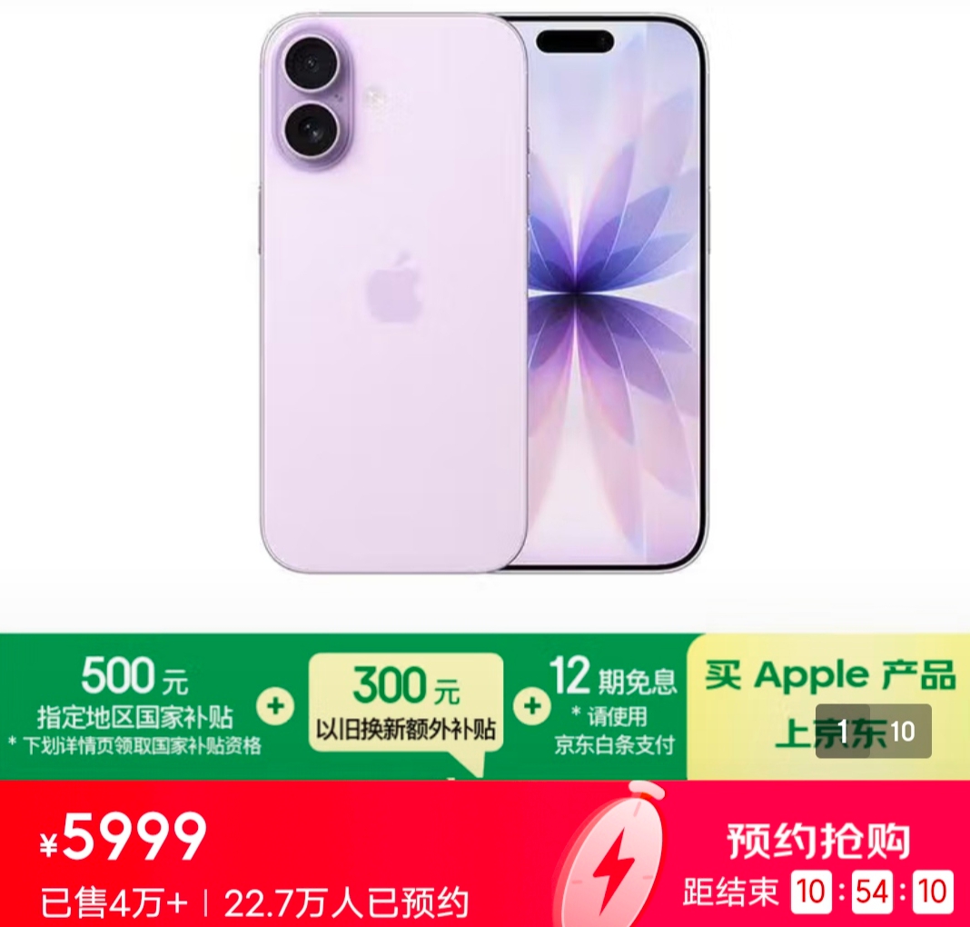 京东平台显示,截至发稿前,iPhone 17标准版已预售超4万台,目前已开启第二次预约,预约人数已超22.7万。