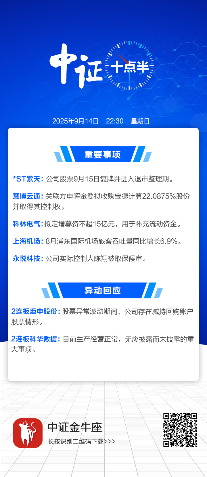 【中证十点半】科林电气拟定增募资不超15亿元;*ST紫天15日复牌并进入退市整理期