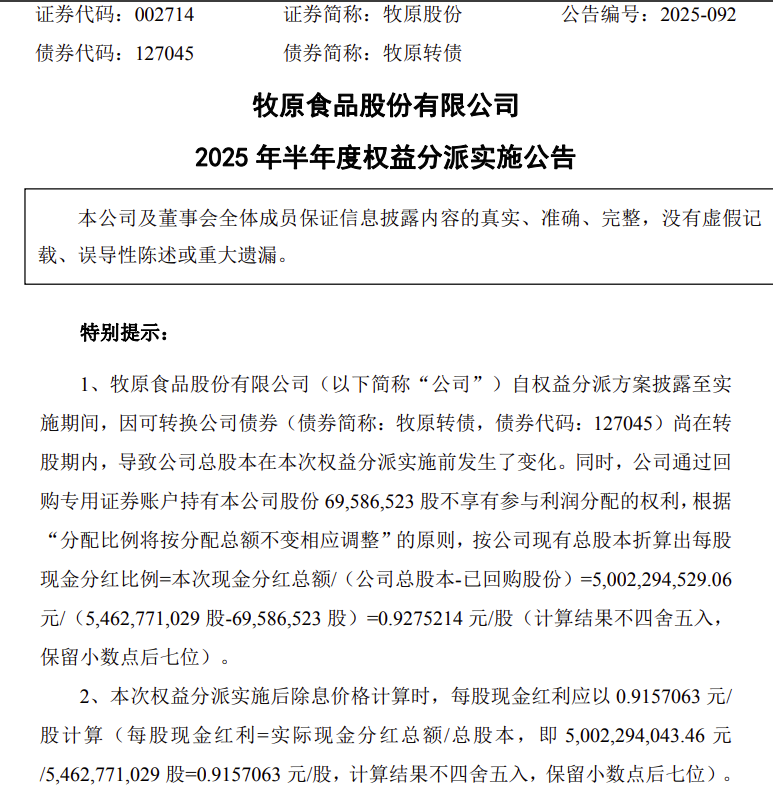 牧原股份10月9日晚间公告,公司2025年半年度权益分派方案为:以公司现有总股本剔除已回购股份后的5393184506股为基数,向全体股东每10股派9.275214元,分红总额50.02亿元(含税)。股权登记日为2025年10月15日,除权除息日为2025年10月16日。