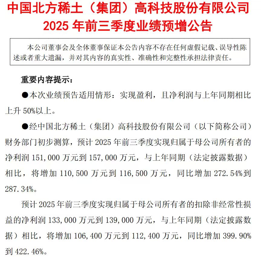 10月10日晚,北方稀土发布公告称,经公司财务部门初步测算,预计2025年前三季度实现归属于母公司所有者的净利润15.1亿元—15.7亿元元,同比增加272.54%—287.34%。预计2025年前三季度实现归属于母公司所有者的扣除非经常性损益的净利润13.3亿元—13.9亿元,同比增加399.90%—422.46%。