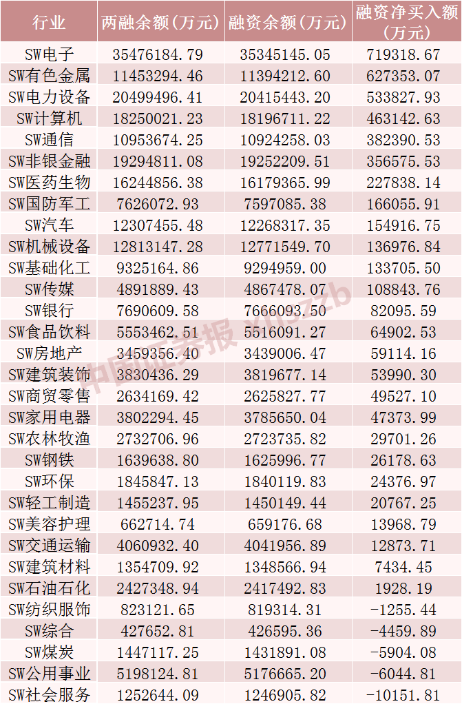 从行业情况来看,上周申万一级31个行业中有26个行业融资余额增加,电子、有色金属、电力设备行业融资净买入金额居前,分别为71.93亿元、62.74亿元、53.38亿元。在出现融资余额减少的5个行业中,社会服务、公用事业、煤炭行业融资净卖出金额居前,分别为净卖出1.02亿元、0.60亿元、0.59亿元。