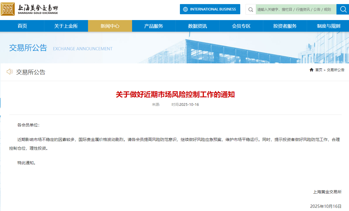 上海黄金交易所网站10月16日发布《关于做好近期市场风险控制工作的通知》。