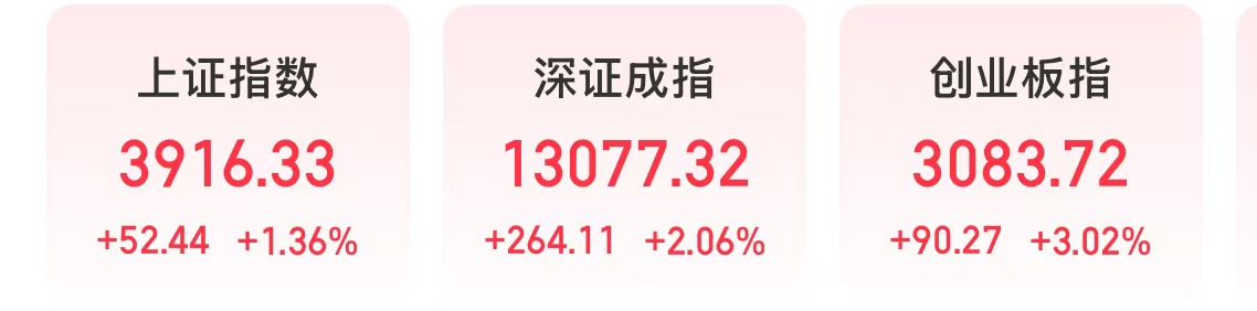 今天,A股上涨。截至收盘,上证指数上涨1.36%,报3916.33点;深证成指上涨2.06%,创业板指上涨3.02%。