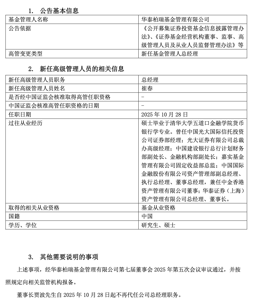 10月28日,华泰柏瑞基金发布公告称,前华泰证券资管董事长崔春担任公司总经理,董事长贾波不再代行总经理职责。
