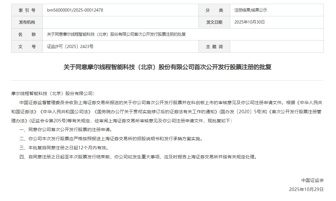 10月30日,证监会网站显示,证监会同意摩尔线程智能科技(北京)股份有限公司首次公开发行股票注册。