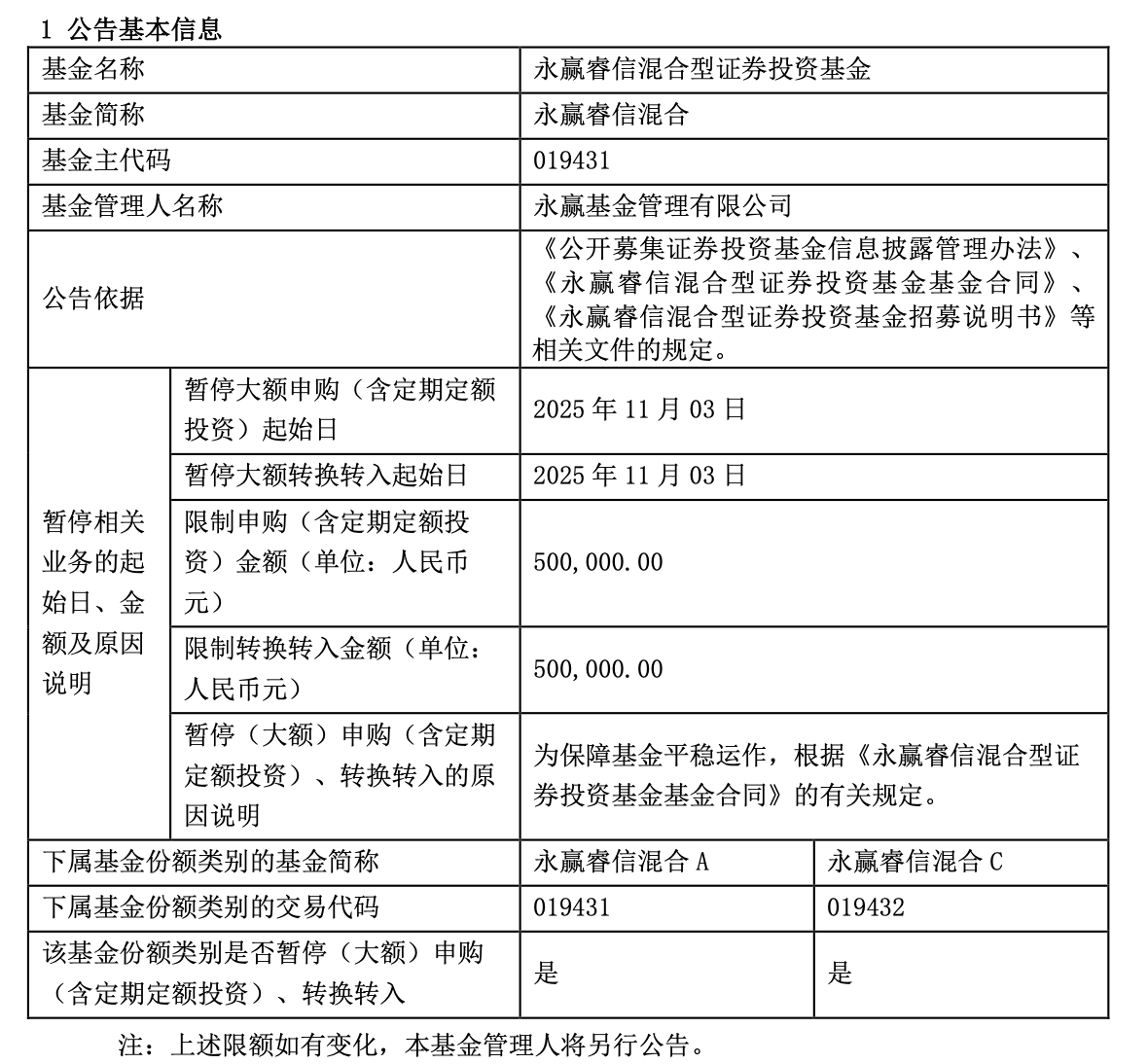 近日,永赢基金发布公告称,自11月3日起,基金经理高楠管理的永赢睿信、永赢睿恒、永赢融安、永赢惠添利集体暂停50万元以上的大额申购。