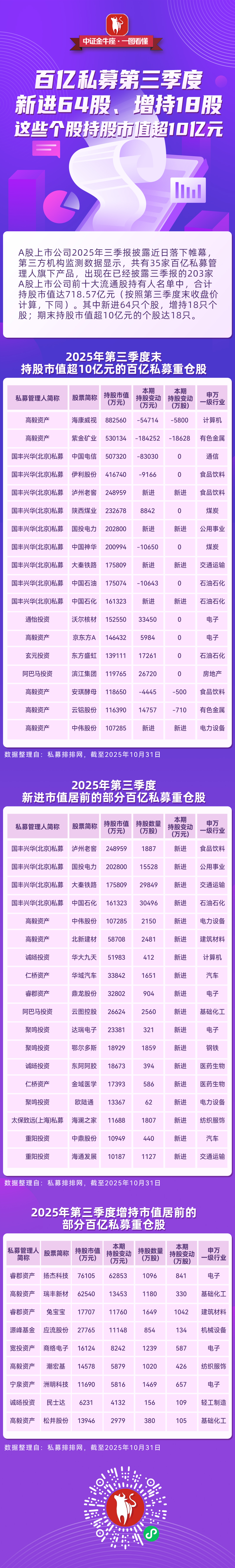 【一图看懂】百亿私募第三季度新进64股、增持18股,这些个股持股市值超10亿元