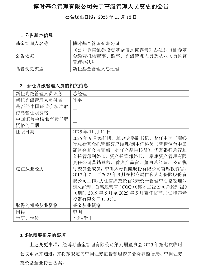 11月11日晚间,博时基金公告称,陈宇自11月11日起任公司总经理一职,董事长张东不再代任总经理职务。
