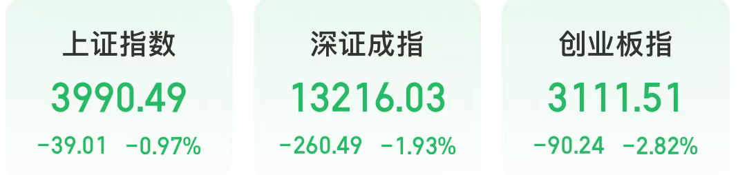 今天,A股调整。截至收盘,上证指数下跌0.97%,深证成指下跌1.93%,创业板指下跌2.82%。