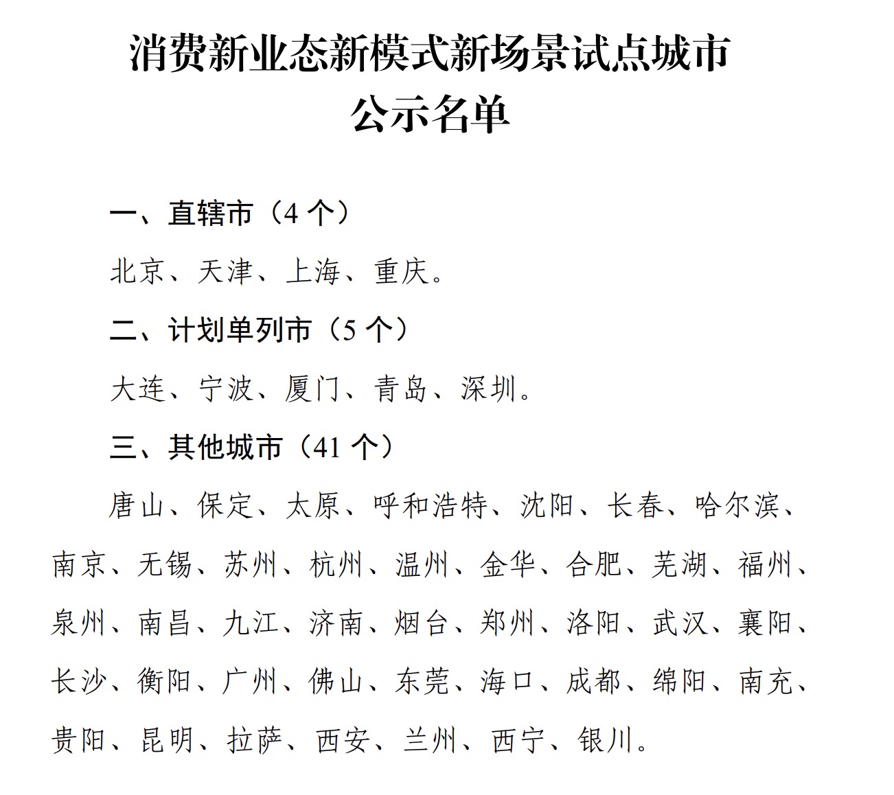 财政部、商务部公布消费新业态新模式新场景试点城市竞争性评审结果,名单包含50个城市