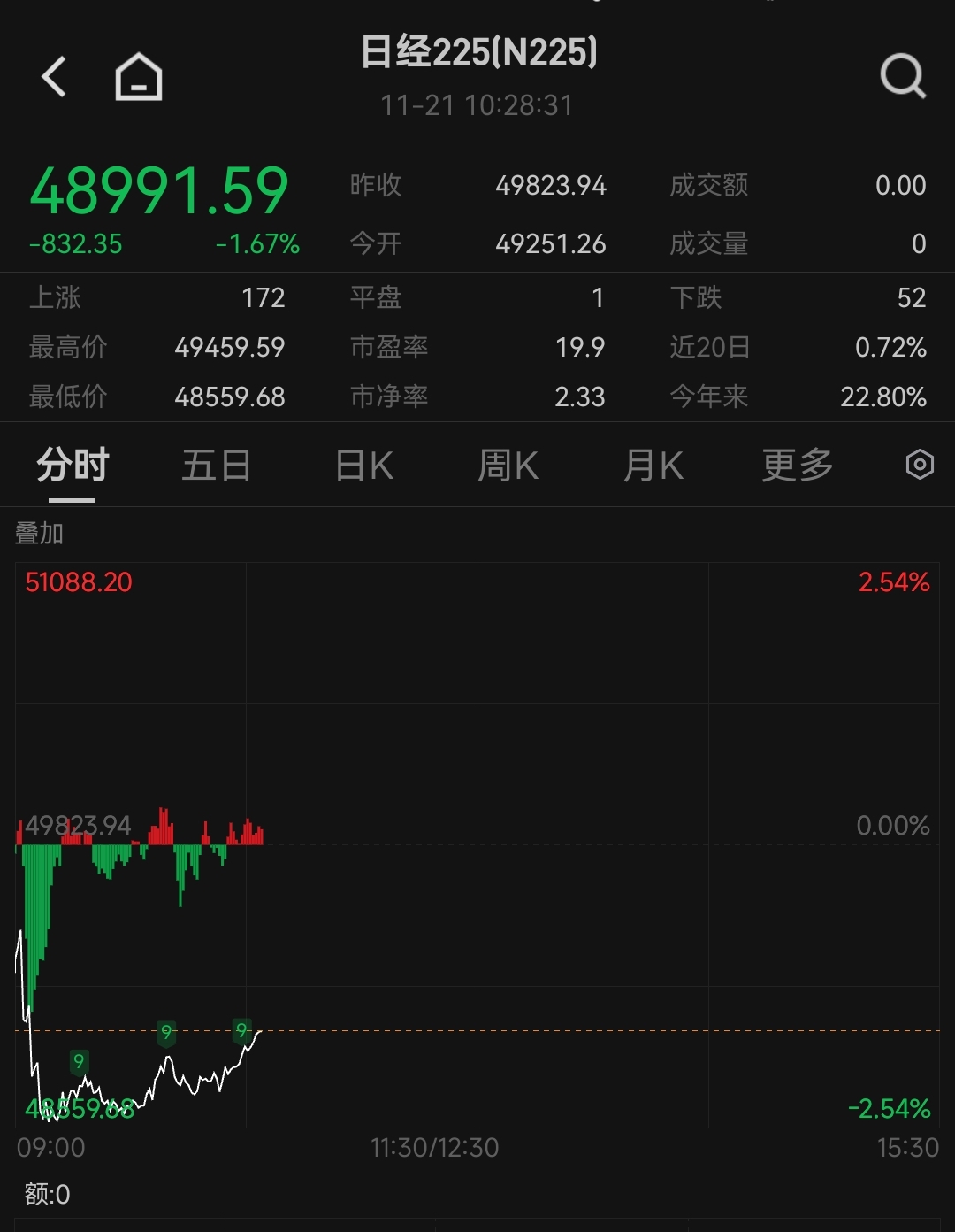 11月21日,日韩股市跟随美股下跌。Wind数据显示,北京时间9:41,韩国综合指数重挫逾4%;日经225指数一度跌超2.5%。