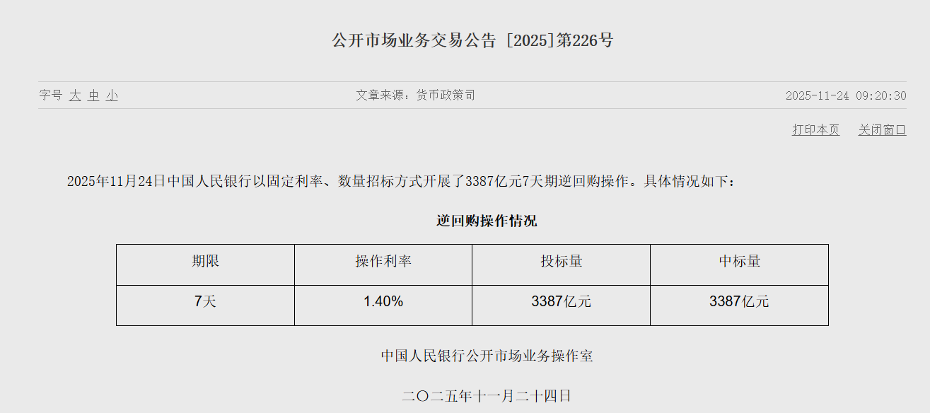 11月24日,中国人民银行以固定利率、数量招标方式开展了3387亿元7天期逆回购操作,操作利率为1.40%,与此前持平。因今日有2830亿元7天期逆回购到期,当日实现净投放557亿元。