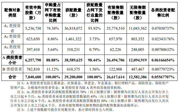 根据《发行安排及初步询价公告》中公布的网下配售原则,发行人和保荐人(主承销商)对网下发行股份进行了初步配售,结果如下: