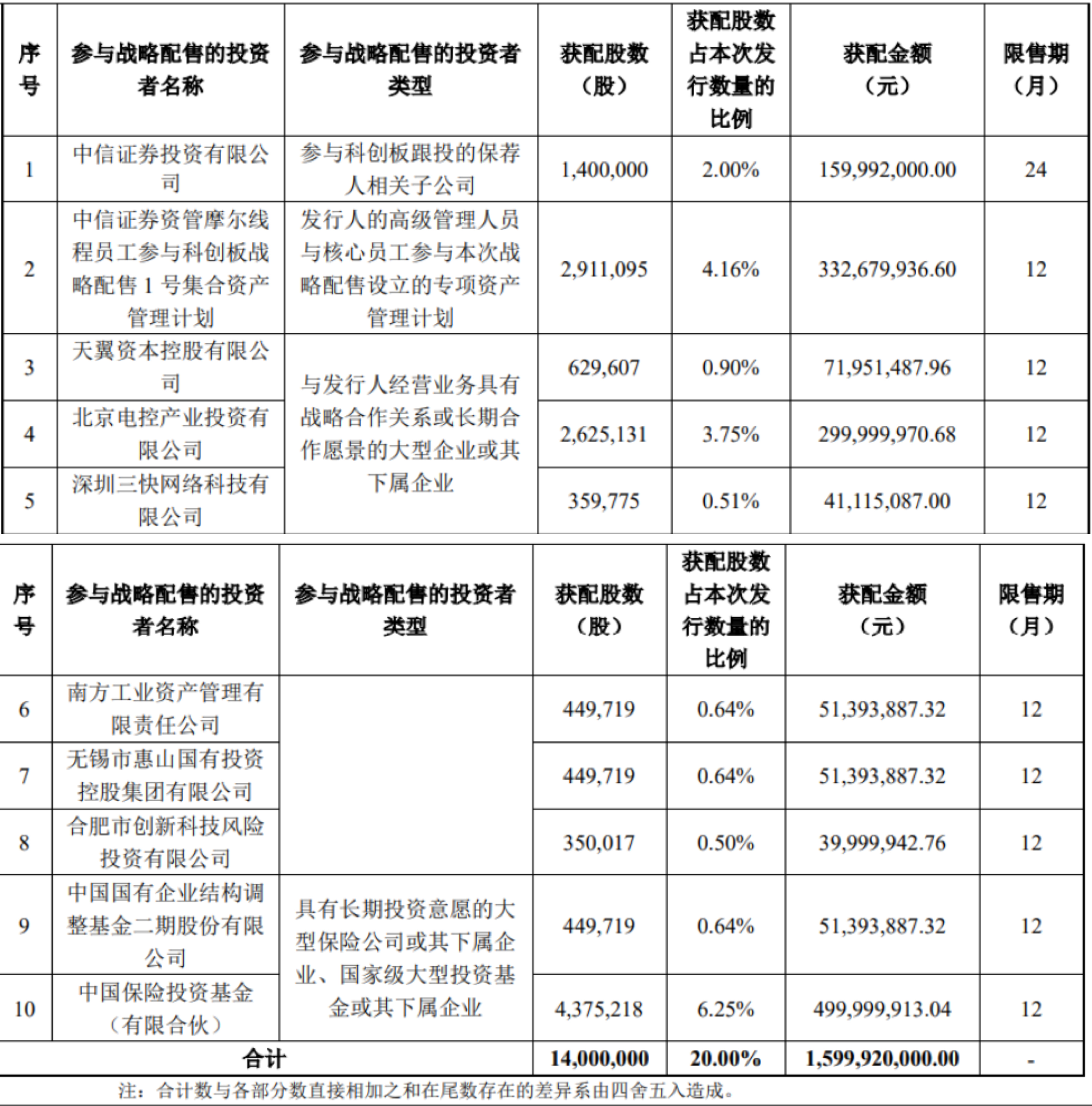 公告称,此次发行的参与战略配售的投资者均按承诺参与了本次发行的战略配售。经确认,《发行公告》中披露参与战略配售的投资者参与本次发行的战略配售有效。本次发行最终战略配售结果如下: