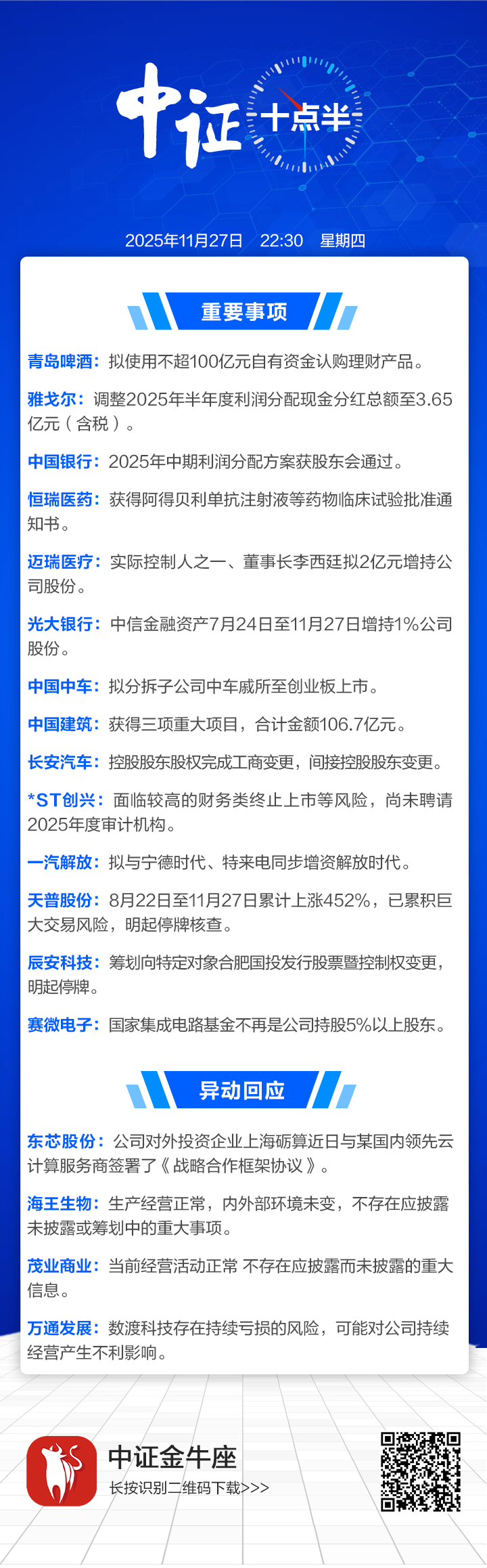 【中证十点半】医疗龙头迈瑞医疗董事长拟增持2亿元;辰安科技筹划向特定对象发行股票暨控制权变更,明起停牌