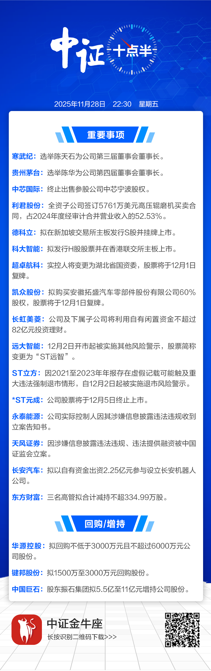 【中证十点半】中芯国际终止出售参股公司中芯宁波股权;贵州茅台选举陈华为董事长