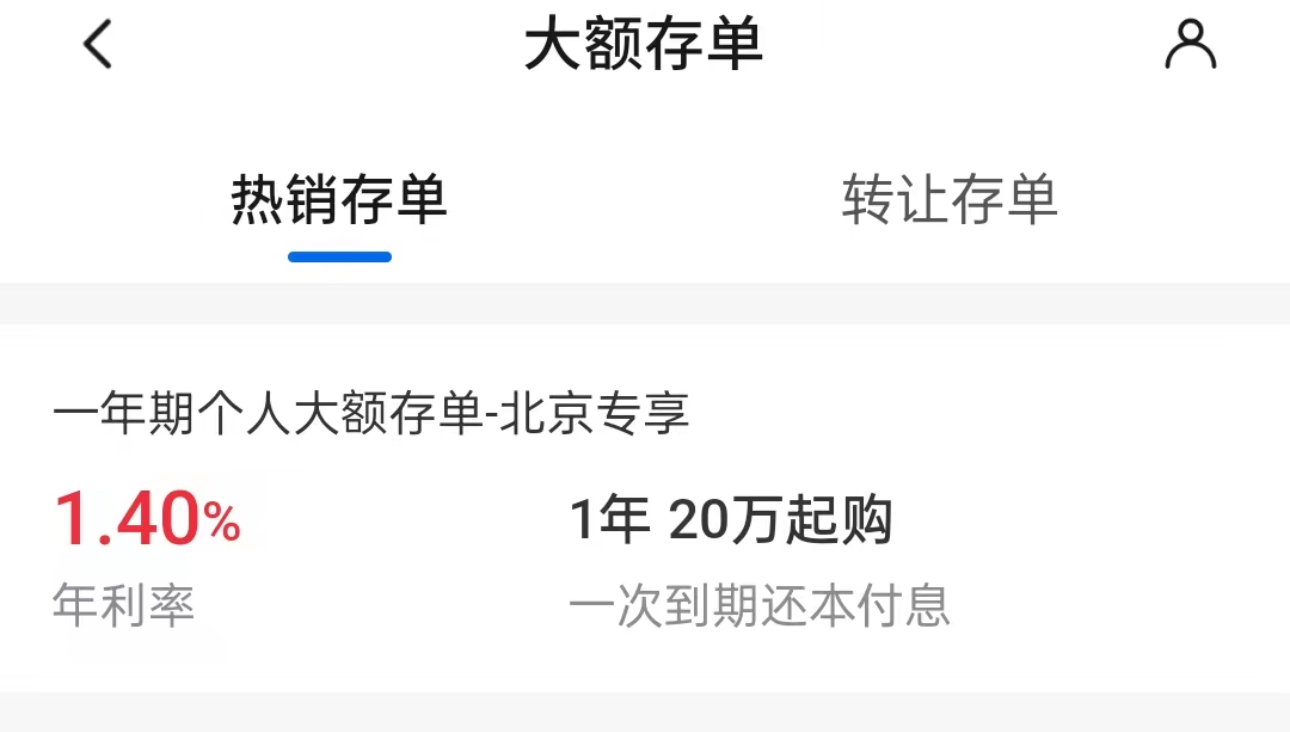 随后,记者从多地交通银行客户经理处独家获悉,目前该行仅针对部分地区客户推出专享大额存单,且期限多为一年期及以下。例如,交通银行北京地区客户经理小许告诉记者,该行仅有北京客户专享的一年期个人大额存单,20万元起购,年利率为1.40%。