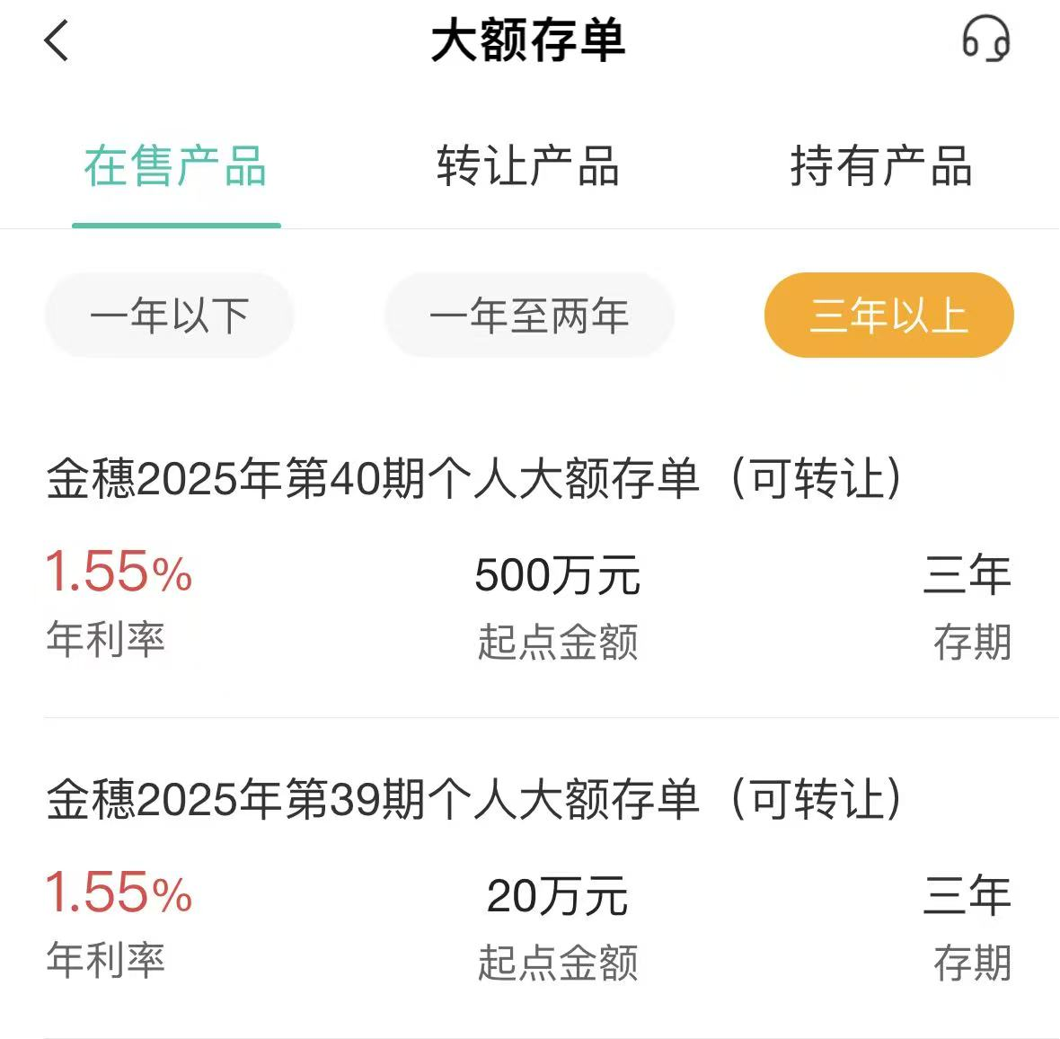 此外,记者查询农业银行手机APP发现,该行三年期大额存单也有两款产品:第39期个人存单(20万元起存)与第40期个人大额存单(500万元起存),年利率均为1.55%。