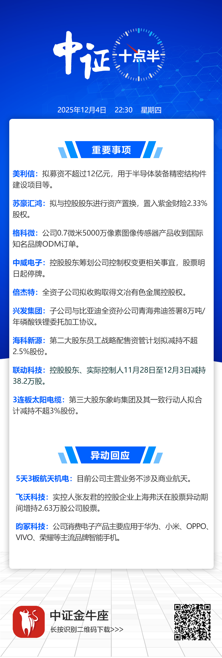 【中证十点半】中威电子控制权或变更;苏豪汇鸿拟置入紫金财险2.33%股权;5天3板航天机电回应
