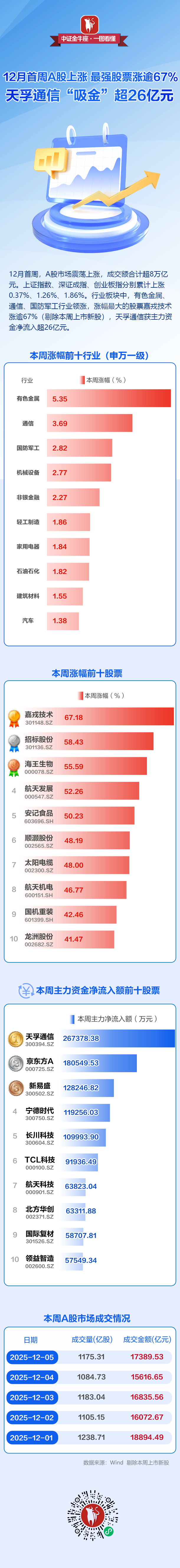 【一图看懂】12月首周A股上涨,最强股票涨逾67%!天孚通信“吸金”超26亿元