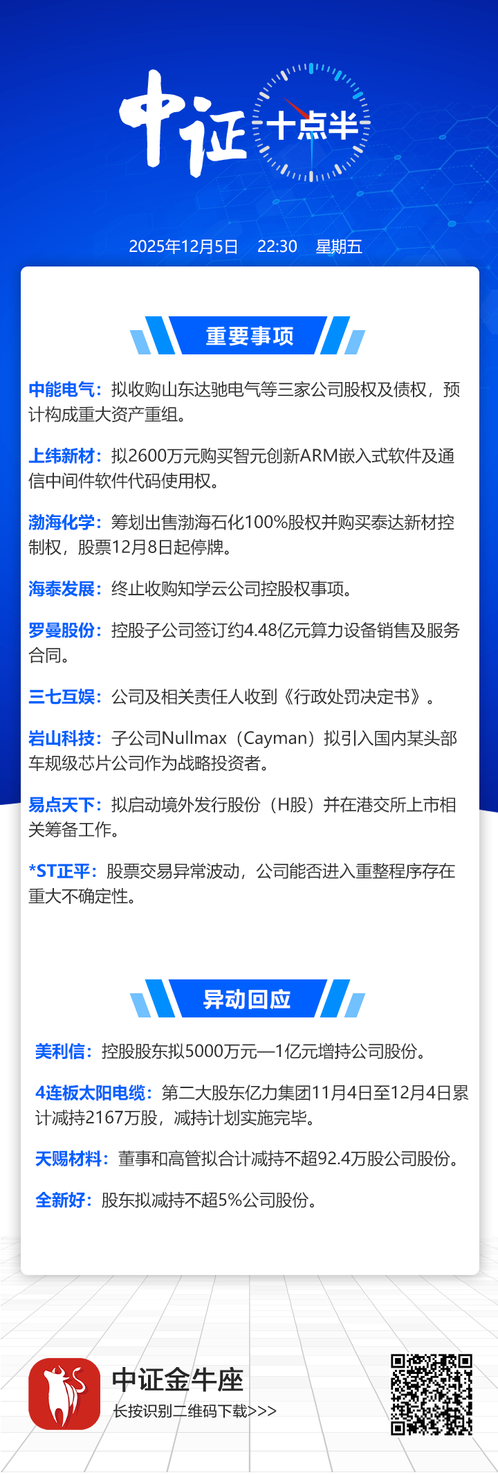 【中证十点半】中能电气拟重大资产重组;海泰发展终止收购知学云控股权;易点天下拟赴港上市