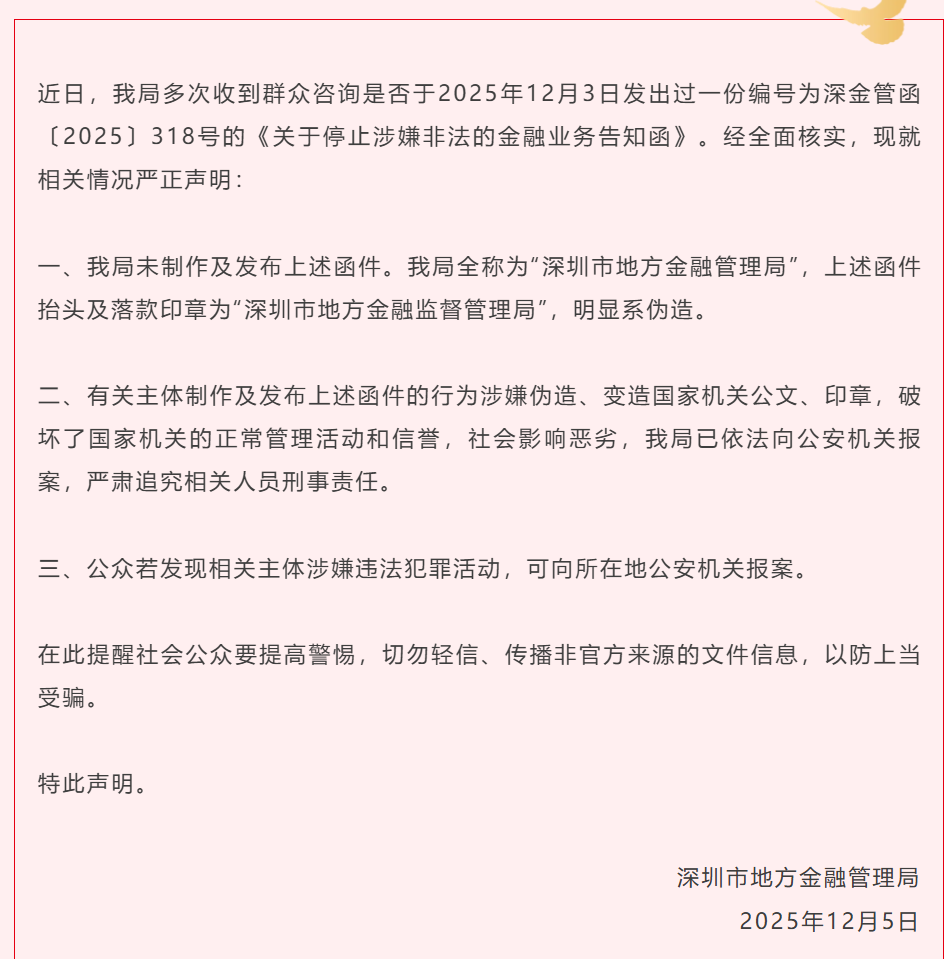 “深圳金融”微信公众号12月6日消息,深圳市地方金融管理局12月5日发布严正声明称,近日,深圳市地方金融管理局多次收到群众咨询是否于2025年12月3日发出过一份编号为深金管函〔2025〕318号的《关于停止涉嫌非法的金融业务告知函》。经全面核实,该局未制作及发布上述函件。