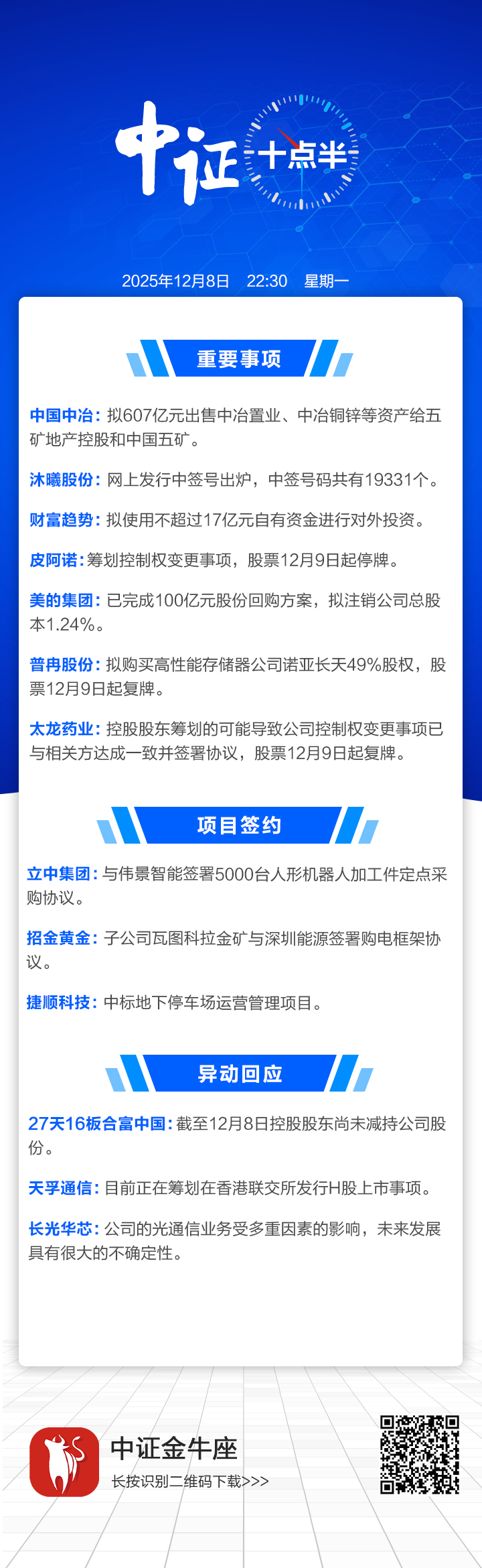 【中证十点半】超600亿元大交易,中国中冶最新公告;美的集团已完成100亿元股份回购方案