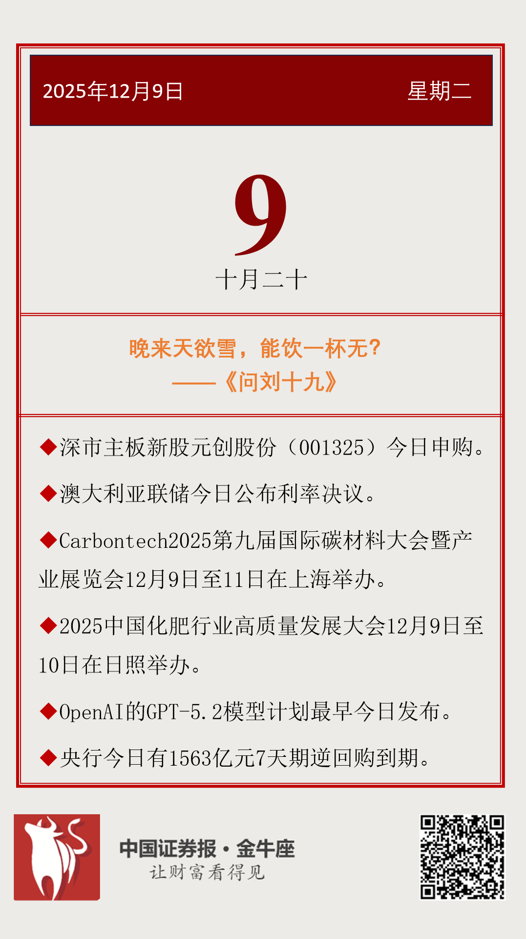 【投资日历】周二(12月9日)资本市场大事