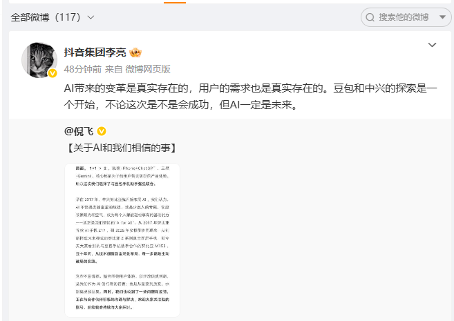 同日,抖音集团副总裁李亮转发该微博并配文称:AI带来的变革是真实存在的,用户的需求也是真实存在的。豆包和中兴的探索是一个开始,不论这次是否会成功,但AI一定是未来。