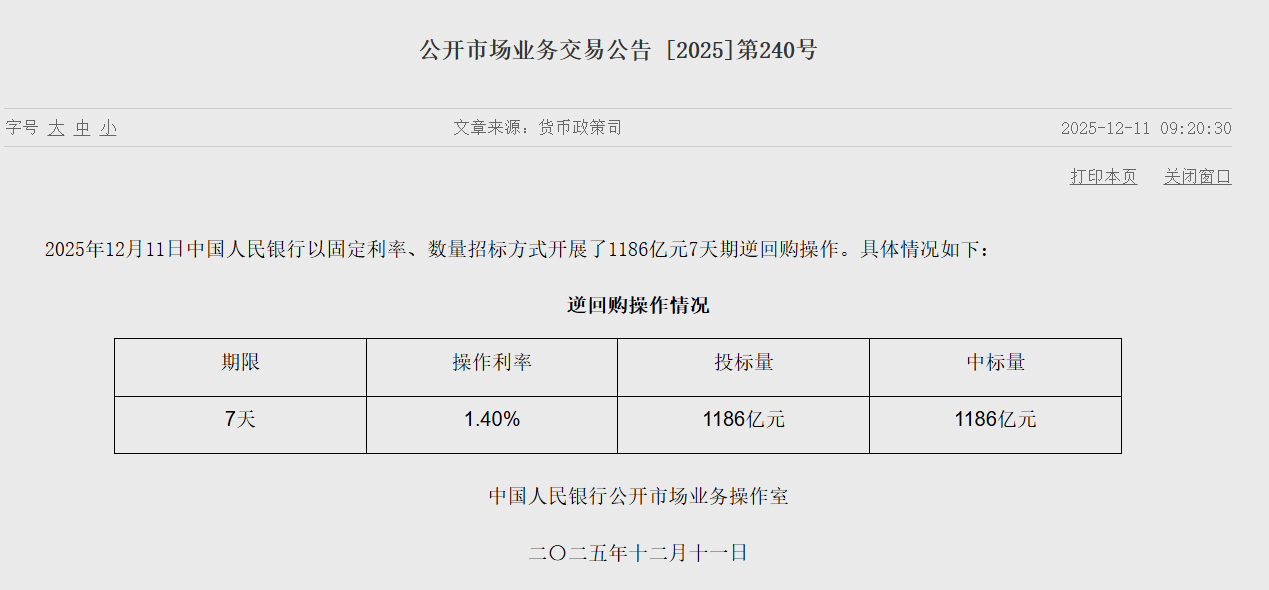 12月11日,中国人民银行以固定利率、数量招标方式开展了1186亿元7天期逆回购操作,操作利率为1.40%,与此前持平。因今日有1808亿元7天期逆回购到期,当日实现净回笼622亿元。