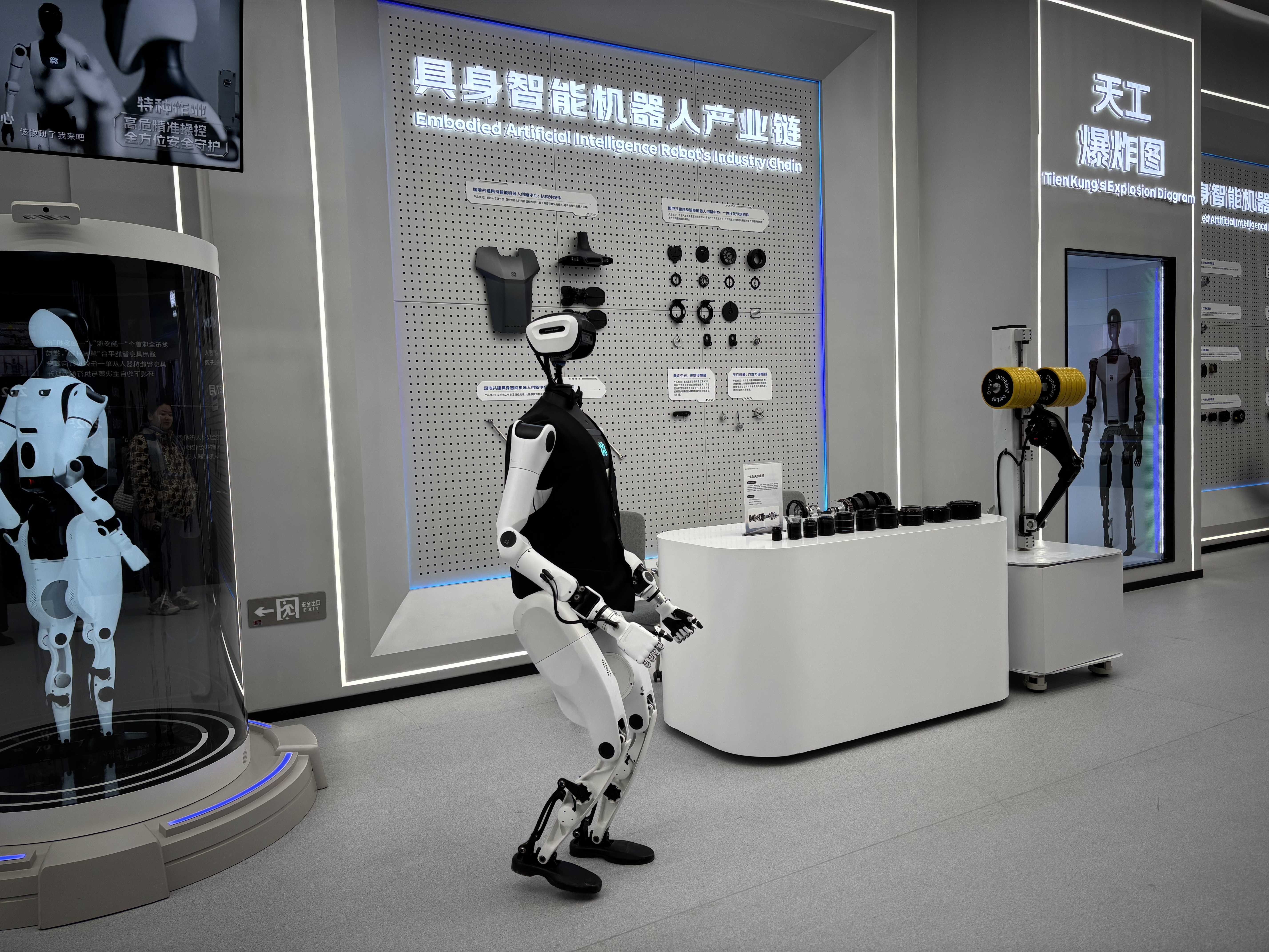 具身天工机器人在北京人形机器人创新中心展厅展示全自主导览。
