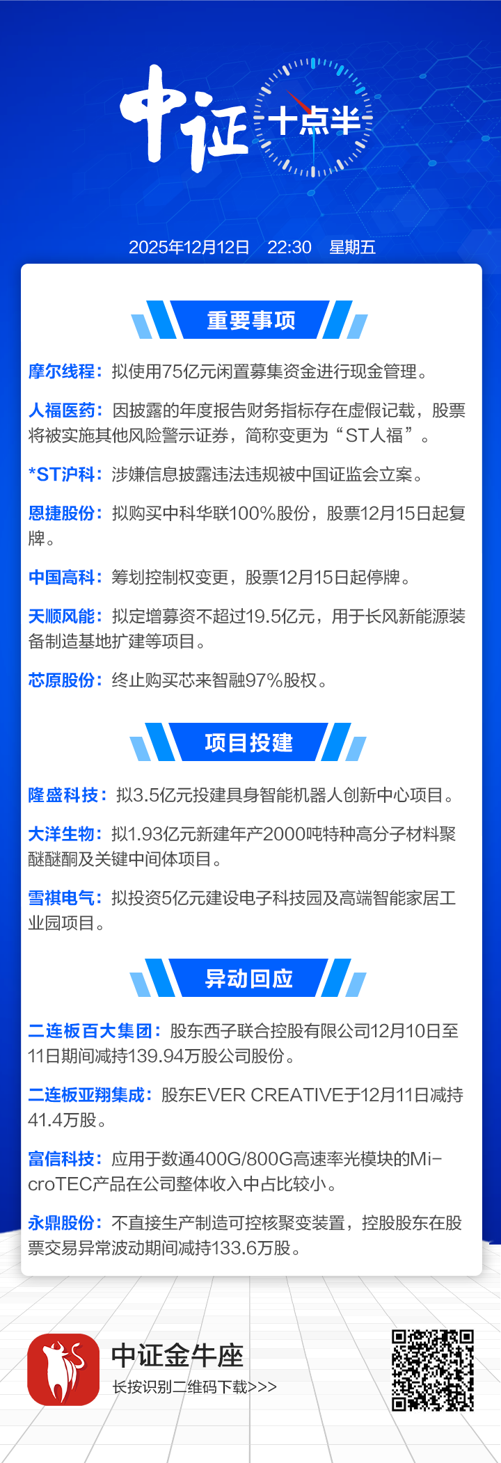 【中证十点半】芯原股份终止购买芯来智融97%股权;隆盛科技拟3.5亿元投建具身智能机器人创新中心项目