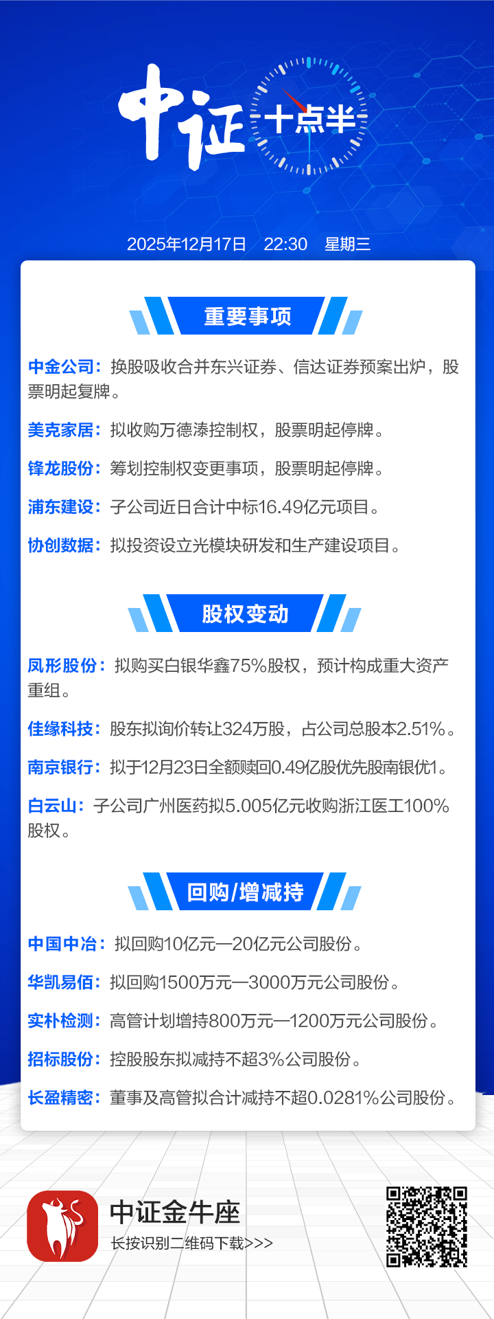 【中证十点半】中金公司换股吸收合并东兴证券、信达证券预案出炉,明起复牌;凤形股份拟购买白银华鑫75%股权,预计构成重大资产重组