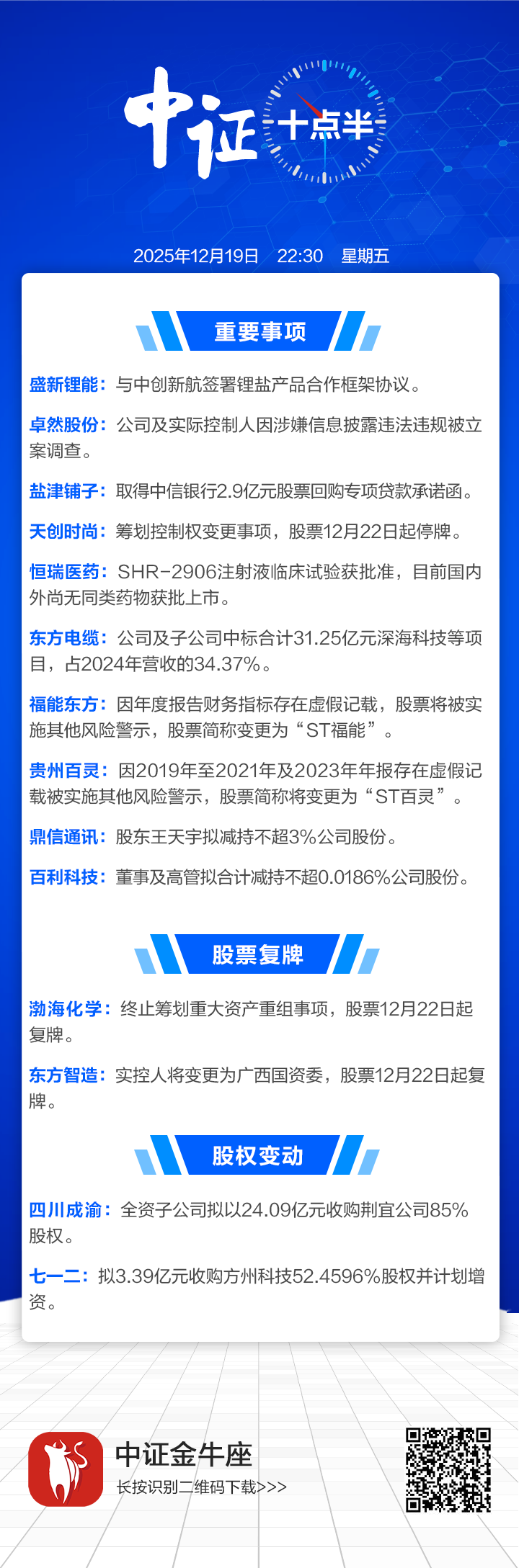 【中证十点半】盛新锂能与中创新航签署锂盐产品合作框架协议;渤海化学、东方智造12月22日起复牌;贵州百灵将被“ST”