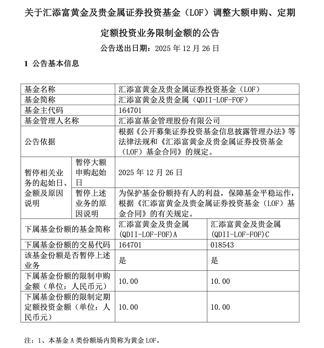 盘后,多家LOF基金管理人发布公告,对旗下LOF产品限购升级。根据公告,自12月26日起,黄金LOF的A份额、C份额限制申购金额由此前的5000元大幅降至10元;国泰商品LOF的A份额、D份额限制申购金额由此前的5000元降至1000元。截至12月25日,黄金LOF、国泰商品LOF的溢价率分别为7.63%、15.42%。