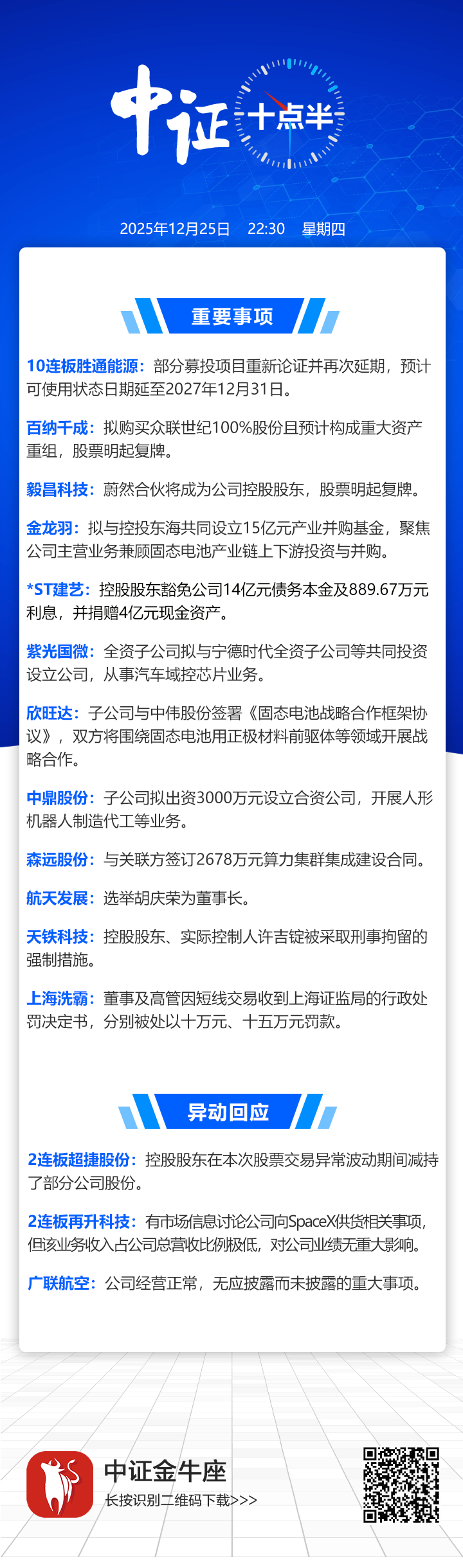 【中证十点半】10连板胜通能源部分募投项目重新论证并再次延期;百纳千成筹划重大资产重组迎新进展,明日复牌