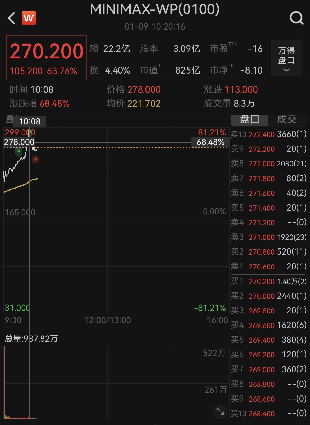 1月9日,MiniMax正式登陆港股,开盘后涨幅持续扩大,盘中涨超80%。Wind数据显示,截至10:20,报270.2港元,总市值达825亿港元。昨日在港股挂牌交易的智谱今日涨超19%,报157.1港元/股,总市值692亿港元。