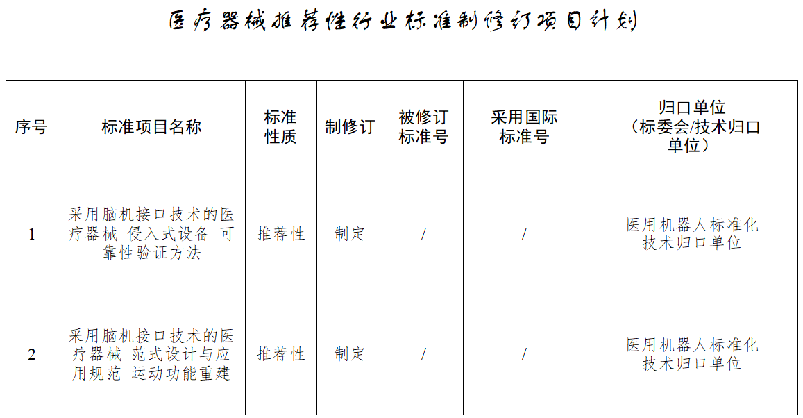 国家药监局网站1月9日消息,根据《医疗器械标准管理办法》《医疗器械标准制修订工作管理规范》要求,国家药监局经公开征求意见和组织专家论证,确定了《采用脑机接口技术的医疗器械 侵入式设备 可靠性验证方法》等两项推荐性医疗器械行业标准制订计划,并予以公示。