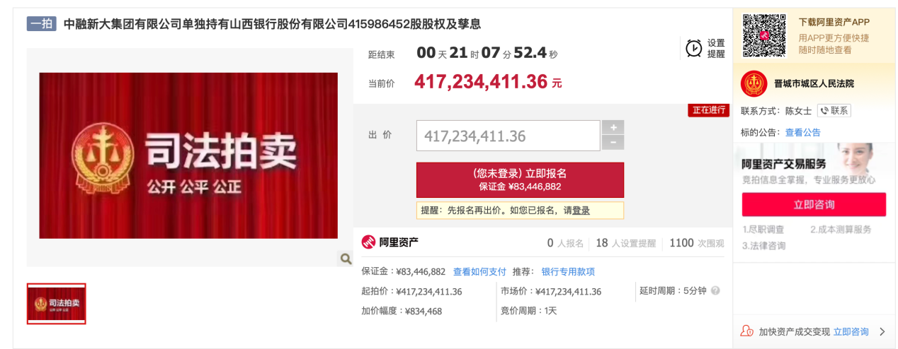 1月11日,阿里资产官方网站显示,中融新大集团有限公司(以下简称“中融新大”)单独持有山西银行415986452股股权及孳息正式开拍,起拍价4.17亿元。
