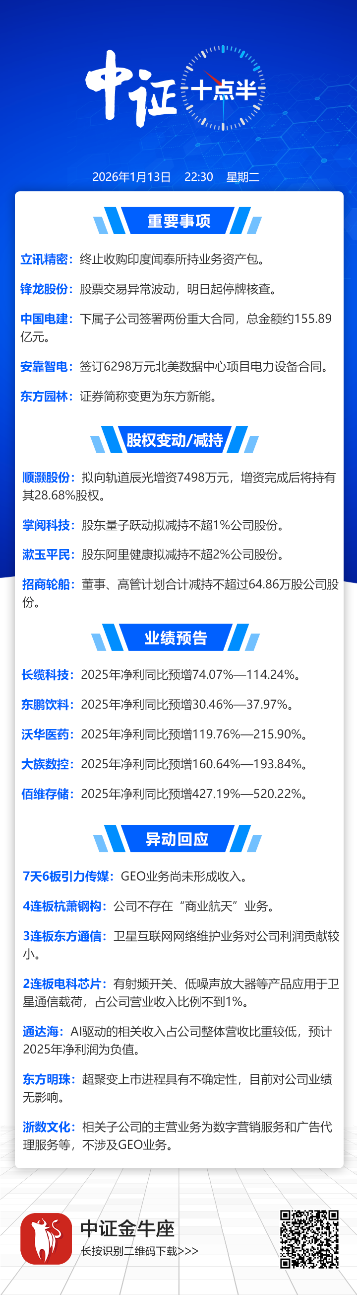 【中证十点半】立讯精密公告,终止收购;佰维存储2025年净利预增超427%;锋龙股份明日起停牌核查