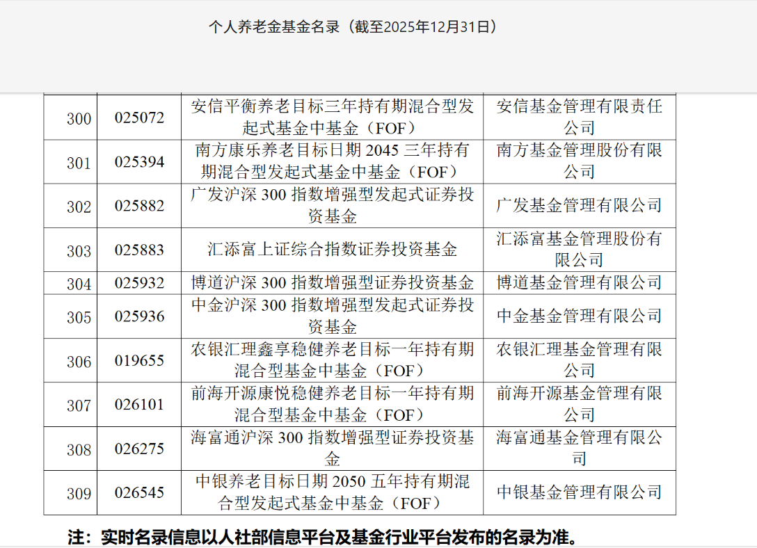 1月16日,中基协更新了个人养老金基金名录,新增7只产品,合计达到309只。